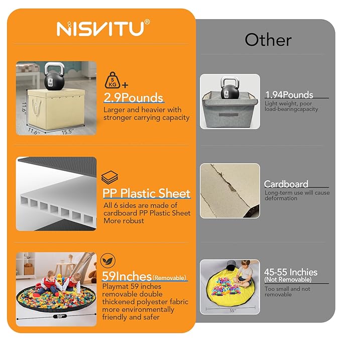 - Play Mat Removable:The toy storage box can be removable into a toy box and Play Mat for Kids. After disassembly, it can be used as two different products, which can be disassembled and connected at will. The toy storage organizer connection uses metal buckles, which are not easy to fall off and be damaged.