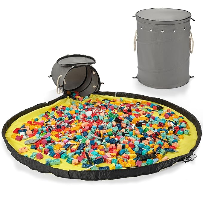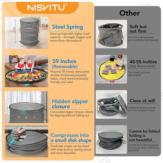 - Plenty of Space:Our kids toy organizer measures 15.5 inches tall and 12.6 inches in diameter, comes with a roomy 59-inch diameter play mat, has fenced edges to prevent toys from scattering, and can hold up to 11 gallons of toys. When the foldable storage box is not in use, the entire storage basket can be compressed into a small round cake that can be fixed with snap buttons. It is small and easy to store,hidden zipper is more beautiful.