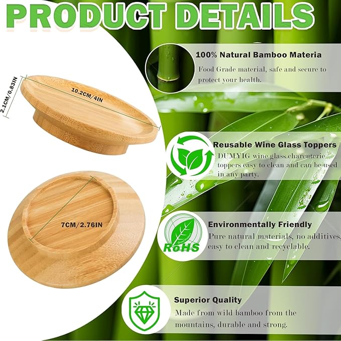- 🍷🍴😍【Wine Charcuterie Board Topper】✅: Dumyig Bamboo Wine Glass Topper Coaster is not just any ordinary coaster; it's a versatile charcuterie board topper. Perfectly sized to fit over your wine glass, it provides a convenient surface for holding your favorite charcuterie snacks while you enjoy your wine.