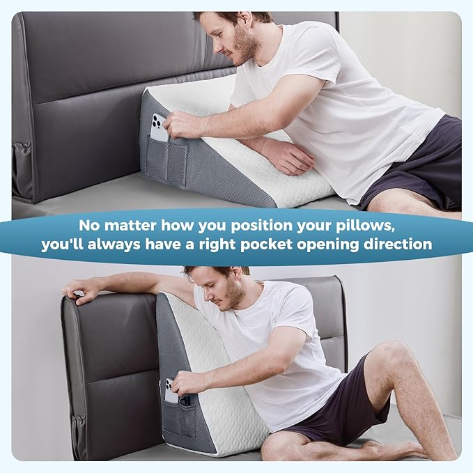 - 【Careful & User-Friendly Design】This wedge pillow includes a convenient carrying handle, 2 side pockets with different orientations, allowing you to store your phone, glasses, or remote control with ease. Additionally, its anti-slip bottom ensures that the pillow remains in place, so you no longer need to worry about it moving around