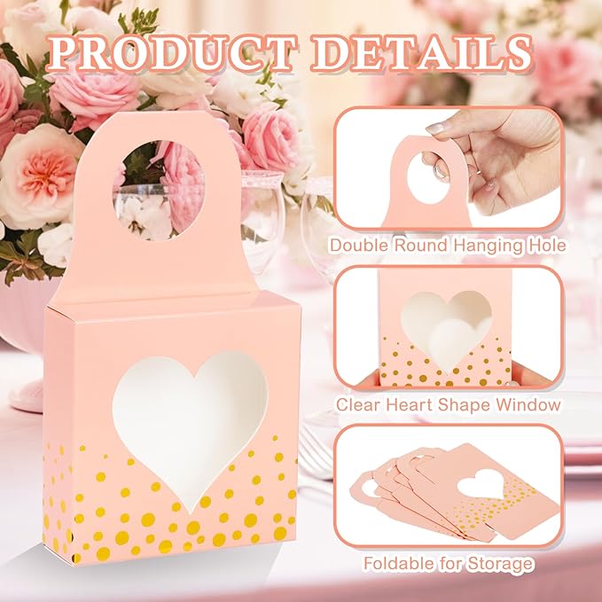 ISKYBOB 25 Pieces Wine Bottle Box with Window, Kraft Paper Wine Boxes for Gifts Hanging Wine Bottle Gift Box Foldable Wine Bottle Hanger Favor Box for Holding Candy Truffles Chocolate Cookies (Pink)