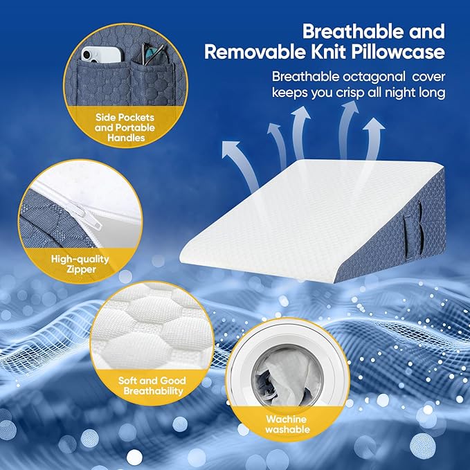 - Machine Washable Knit Pillowcase: Our triangle bed wedge pillow comes with a hotel-grade air-layered knit fabric pillowcase that is not only soft and breathable but also easy to remove and machine washable. With a convenient side zipper design, maintaining cleanliness and freshness is a breeze. The non-slip PVC particles on the bottom ensure that the foam wedge pillow stays in place, providing unparalleled comfort.