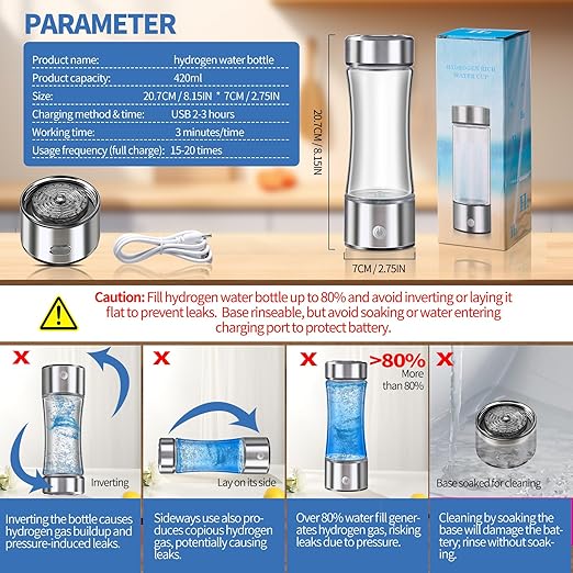 - Easy to Use and Effortless Maintenance:Just fill up to 80% and press the button to activate; enjoy the blue light show as your water infuses with hydrogen gas. The hydro health hydrogen water bottle with easy-disassemble design makes maintenance a breeze, ensuring you always sip the best quality hydrogen-rich water. (Remember to fill wisely and keep the hydrogen water bottle upright to avoid leaks and rinse the base gently, not soaking to protect the device.
