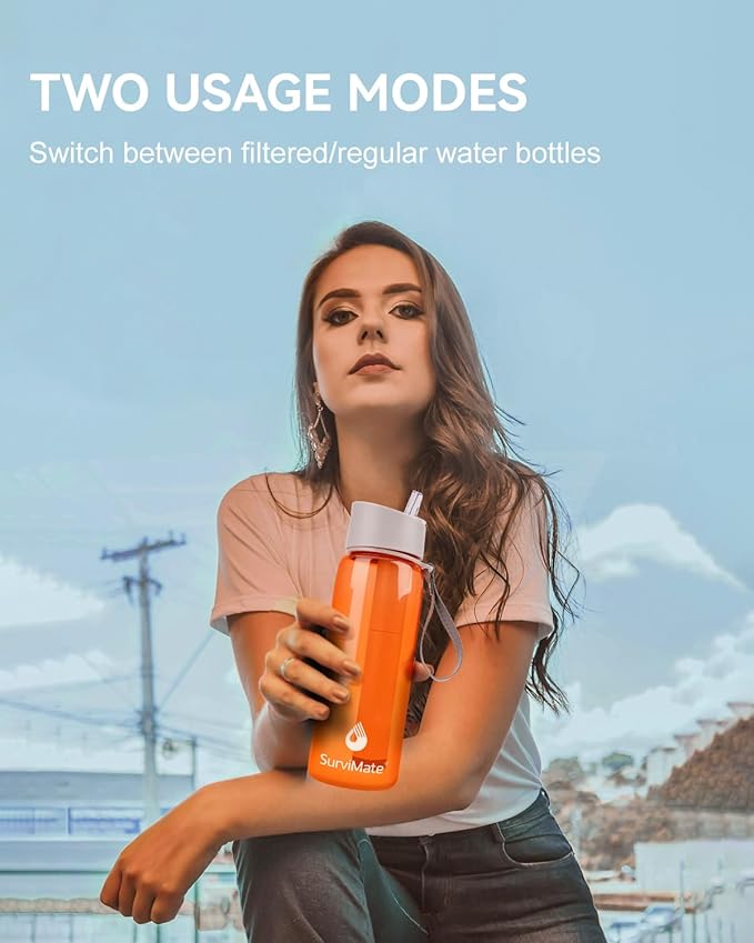 - 4-Stage Filtration - The Survimate water filter bottle adopts a composite filter technology, can reduce most contaminants. The filter element uses a coarse filter screen, a 0.01μm hollow fiber UF membrane, a sediment PP membrane and an activated carbon fiber to reduce chlorine, bad odor and intercept heavy metals, sediment, soil, organic matter and other impurities, etc.