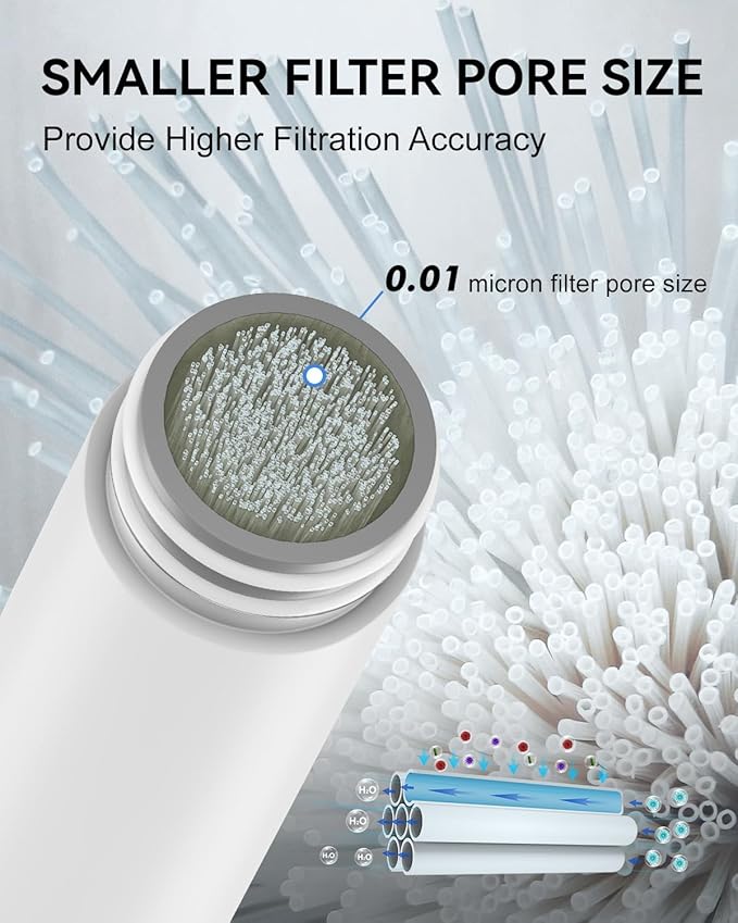 - Smaller Filter Pore Size - The filter pore size of the hollow fiber UF membrane is 0.01 microns so that it can filter out 99.99% harmful materials from the water while other brands' filter pore size is only 0.2 microns. The smaller filter pore size, the higher filtering accuracy.