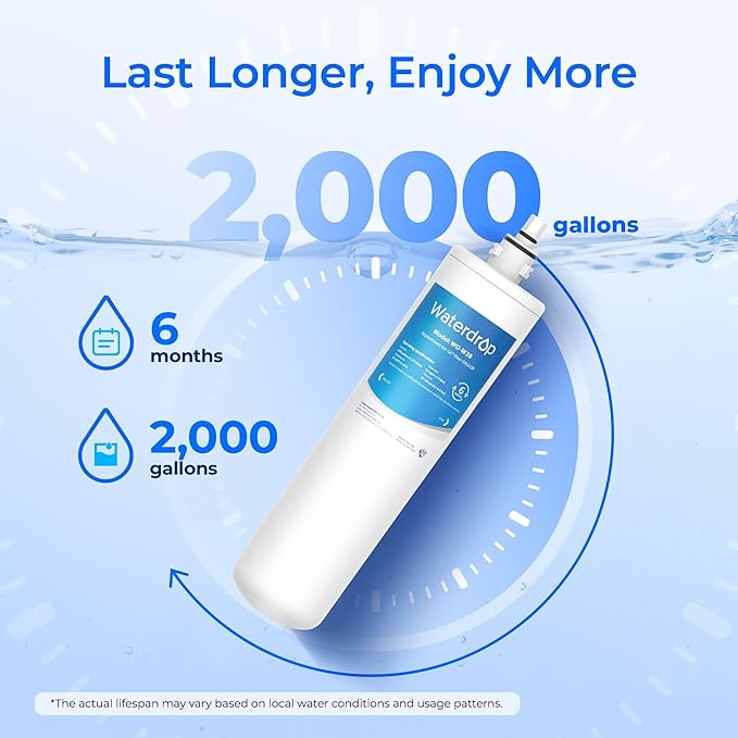 - [Extended Filter Life] This replacement filter has an extended filter life of 6 months or 2,000 gallons, which may vary based on your local water conditions and water usage. Its ultra-long filter life means less frequent replacement, and this also help save our planet and your bills. With two filters, you can save over 30,000 plastic bottles every year.