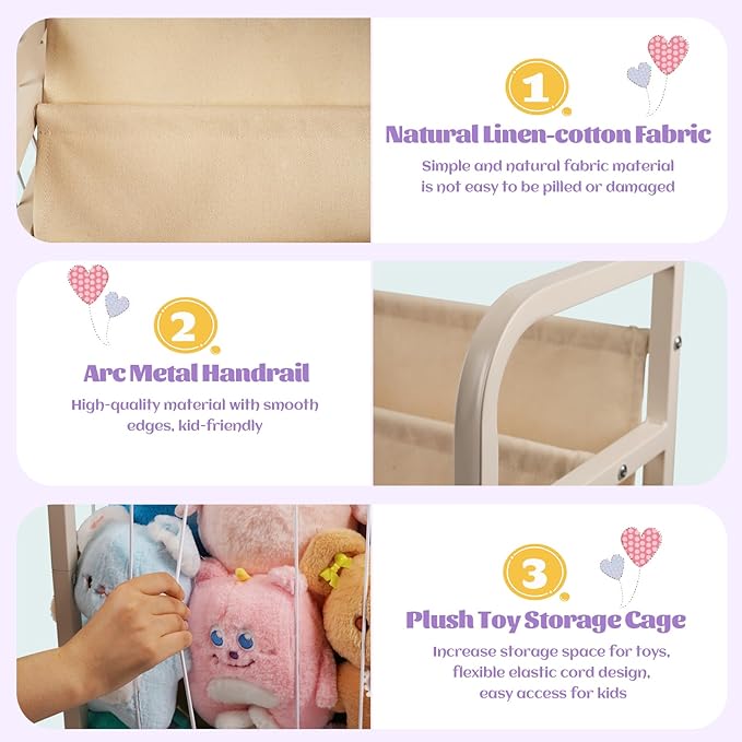 - Unique Soft toy organizer & Kids Bookshelf Storage: The bookshelf is designed of using on children's room, Combined with the lovely stuffed animal cage design, children will enjoy putting things away for themselves, can remove and replace their favourite soft toys and furry friends safely and easily. In addition to being the best stuffed animal storage, the book storage bag displays books with front covers and is the perfect height for toddlers and children to easily identify and access.