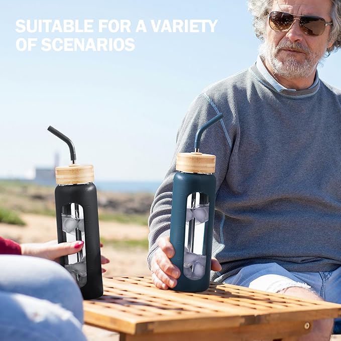 - HIGH-QUALITY & 100% BPA FREE - Our borosilicate glass water bottle is free from BPA, BPS, PVC, and lead. The stylish silicone sleeve adds extra protection against slips and falls. It is suitable for both hot and cold beverages (-4°F to 302°F). The wide-mouth design makes it easy to fill with ice cubes and fruits, and easy to clean daily.