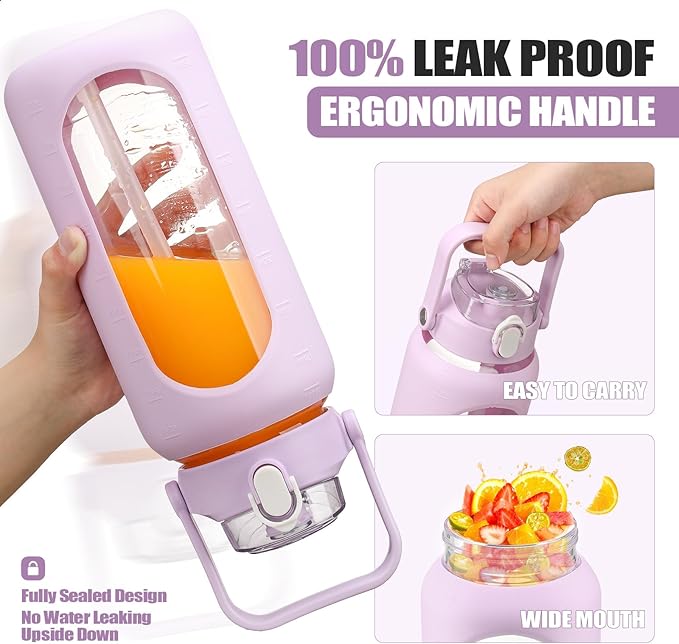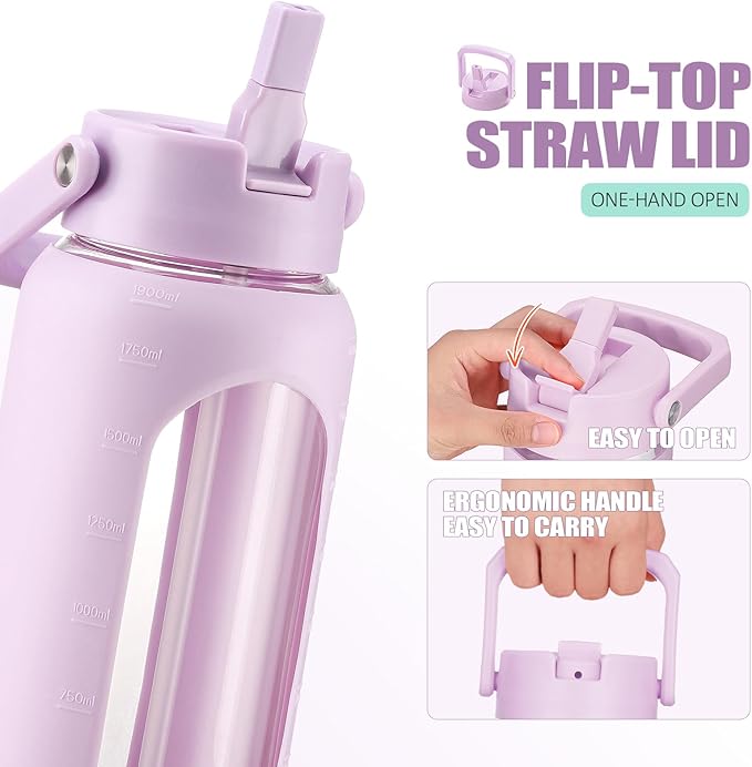 - TWO LIDS DESIGN: Our motivational glass water bottle boasts 2 lids, a flip lid and a spout lid, to meet your various needs of drinking on different occasions and making you get 2 bottles with 1 bottle’s cost.