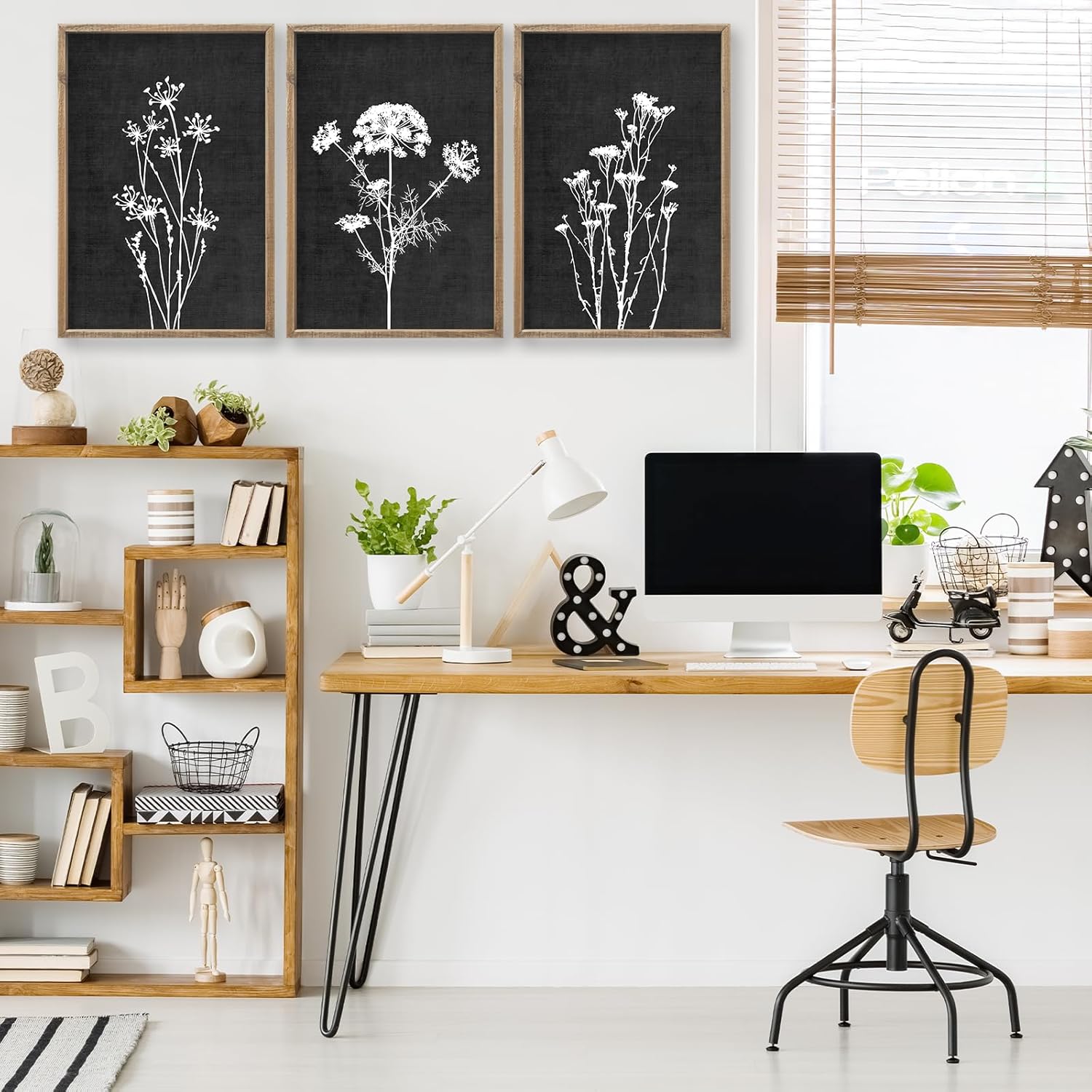 Flower Plant Wall Art Decor 16"x11" Set of 3 Black And White Botanical Painting Wood Framed For Minimalist Bedroom Office Rustic Living Room Abstract Wildflower Sign Hanging (Wood Black)