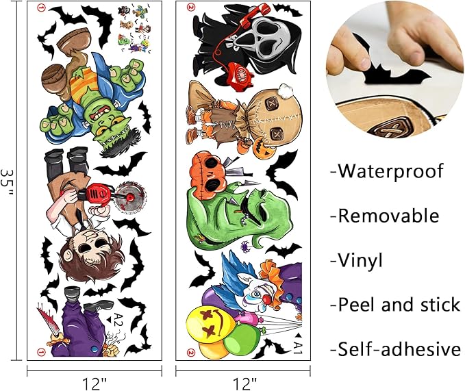 - Bedroom Decorations: Our Halloween wall decals are designed with various vivid patterns like Grim Reaper, Sam, Frankenstein, joker, chainsaw killer, green monster, bat. These horror movie merchandise wall decals and stickers are suitable for bedroom, living room, kitchen, bathroom, patio, farmhouse, retail store, restaurant, coffee house and party supplies. Perfectly DIY a scary space for your home and office
