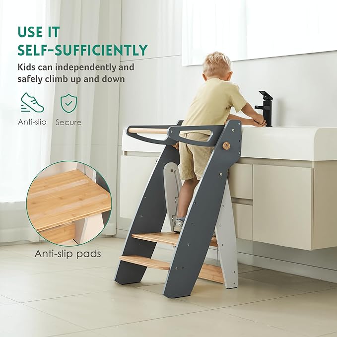 - 【Children-Safe Design】Our foldable toddler standing tower, crafted from premium materials for safety, features a sturdy “A” frame with non-slip pads, a wider standing board, an enclosing safety rail that prevents falls and can be lifted for easy entry, and easy-grip, splinter-free handles. CPC-certified and constructed to high standards, it guarantees security and peace of mind, empowering your child to embark on their journey towards independence with confidence.