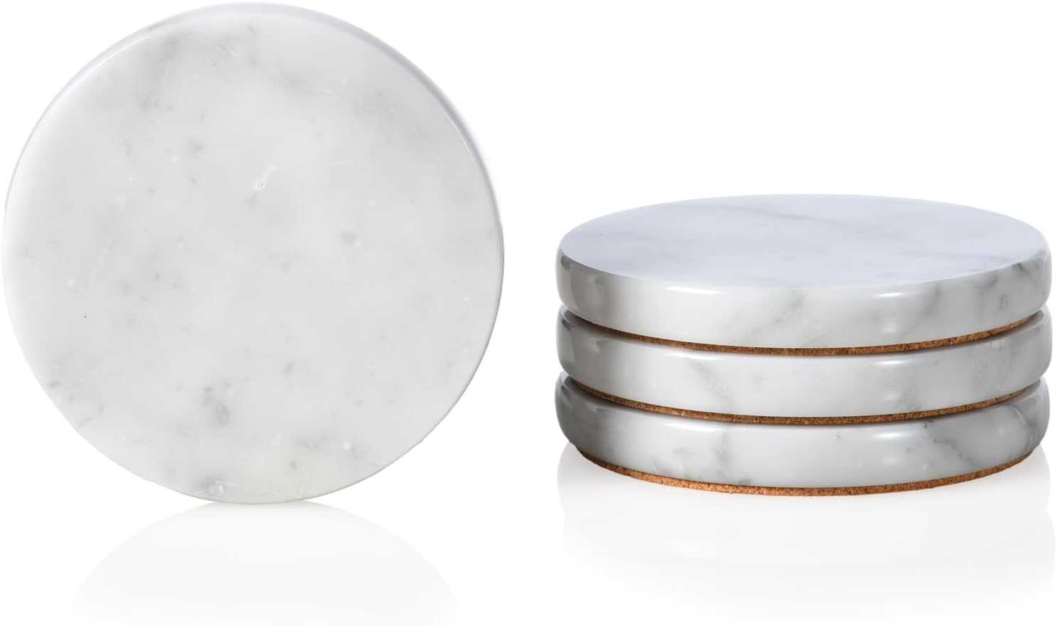 - Simple and Practical: Including 4 pieces of natural carrara white stoneware coasters (size: Φ4'' x H0.4'') , the drink accessory set is a good size for all kinds of glasses, teacups and mugs, which can hold hot and cold drinks without worry. Classic round design, practical and stylish, perfect for kitchen, living room, bar, hotel, restaurant, party and so on