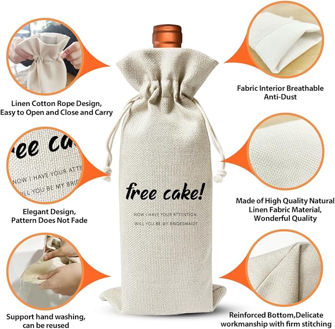 - PREMIUM MATERIAL: Our funny Bridesmaid to be wine bag is made of high-quality cotton linen material fabric, printed double-sided, odorless, smooth appearance, durable and reusable. At the same time, it has very good quality and safe enough to protect or hold wine or champagne bottle.
