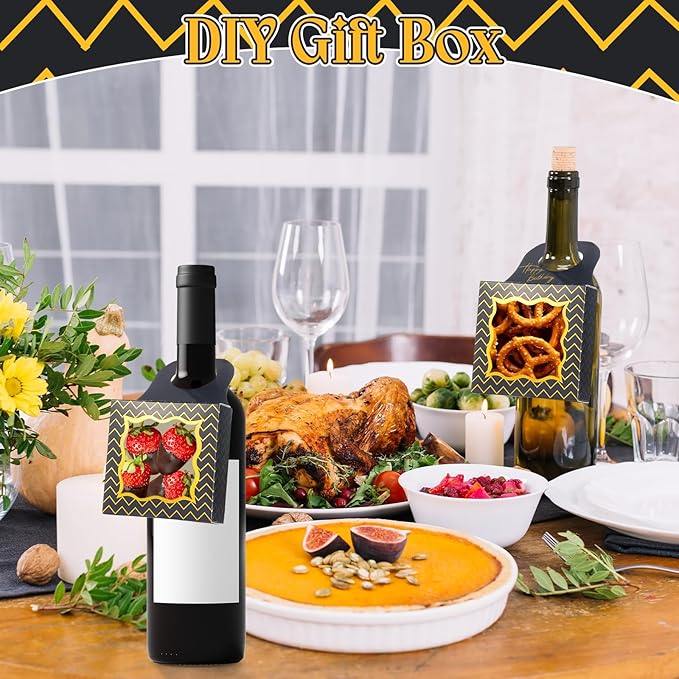 • UNIVERSAL SIZE - Wine bottle hanging boxes are 3.5 x 3.5 x 1.2 inches / 9 x 9 x 3 cm in size, and the hanging hole diameter is 1.5in / 3.8cm. Thick waterproof kraft paper material makes candy box durable and easily to hang on various size glass bottles such as champagne, prosecco, beers, and also plastic bottles like soda and water bottle.