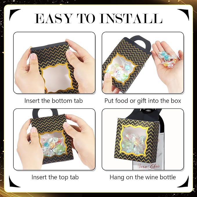 - UNIVERSAL SIZE - Wine bottle hanging boxes are 3.5 x 3.5 x 1.2 inches / 9 x 9 x 3 cm in size, and the hanging hole diameter is 1.5in / 3.8cm. Thick waterproof kraft paper material makes candy box durable and easily to hang on various size glass bottles such as champagne, prosecco, beers, and also plastic bottles like soda and water bottle.
