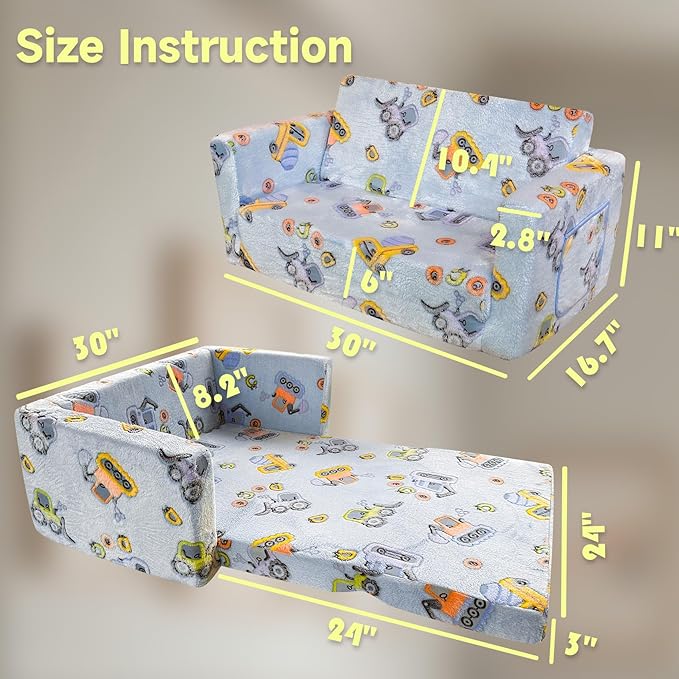 - Quality & Safety Assurance: The Sofa is size at 30"W x 17"D x 16"H, the Lounger Flipped Open is size at: 30"W x 41"D x 11"H. The supportive foam keeps its shape and provides all-day comfort. The cover of this kids sofa is made of high quality 100% plush polyester, providing extra soft comfort for all toddlers, children, and adults. The pads of the folding sofa use durable and comfortable sponge, even adults will love it. Soft and durable foam core means it's very safe for the kids. This is both a sofa & bed for them.