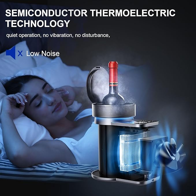 • Preserve wine flavor and aroma: An electric wine cooler ensures your wine is stored at the ideal temperature and humidity levels to preserve its flavor and aroma. No more wasted open bottles! Step one: Open the wine bottle cooler. Step 2: Set customizable temperature. Step 3: Place a suitable bottle (less than 3.74 inches in diameter) into the wine cooler. Step 4: The device begins to cool down. The LED will flash until the set temperature is reached. It will continue to glow after that and no more ice is needed.