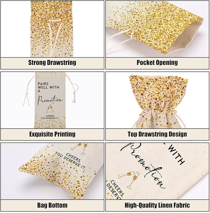 • Perfect Design And Size: Our wine bottle gift bags are 14.2 x 5.5 inches, can hold red wine bottles or champagne bottles, drawstring design makes it easy for you to put in and take out the wine bottles. Tighten the drawstring to protect your bottle from exposure. Can enhance the elegance and novelty of supplies and decorations for various party occasions. This is a unique gift for men, women, mom, colleague, grandma, friend, sister, bride, bridesmaid, father, groom.