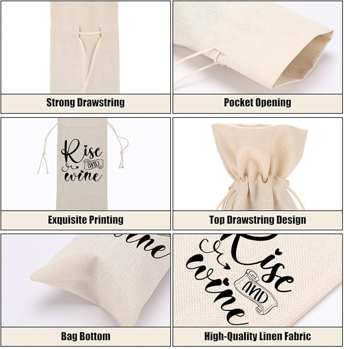 • Premium Material: Our wine gift bag is made of high-quality linen fabric, which is durable and reusable, reducing the impact on the environment. Good quality, strong support and safe enough to protect and hold wine or champagne. There is a drawstring design at the opening for easy opening.