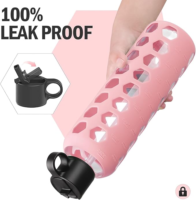 MUKOKO Glass Water Bottles, 32oz Glass Tumbler, Drinking Bottles with 2 Lids-Handle Flip Straw Lid&Bamboo Lid, Motivational Water Bottle with Time Marker and Silicone Sleeve, Leakproof-1 Pack-Pink