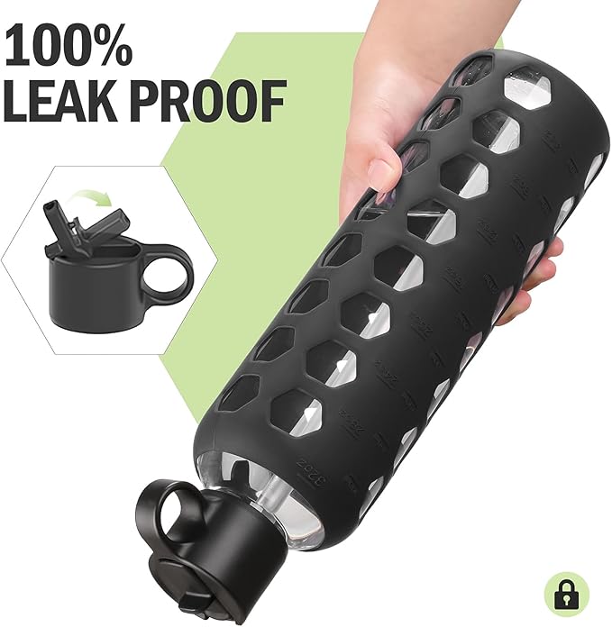 MUKOKO Glass Water Bottles, 32oz Glass Tumbler, Drinking Bottles with 2 Lids-Handle Flip Straw Lid&Bamboo Lid, Motivational Water Bottle with Time Marker and Silicone Sleeve, Leakproof-1 Pack-Black