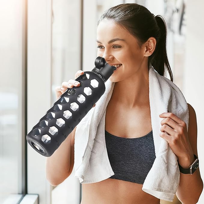- GLASS WATER BOTTLES WITH TIME MARKER:MUKOKO 32oz glass water bottle with time marker preserves the purity of water.This is a very handy way to keep up with daily water intake,stay hydrated and healthy.