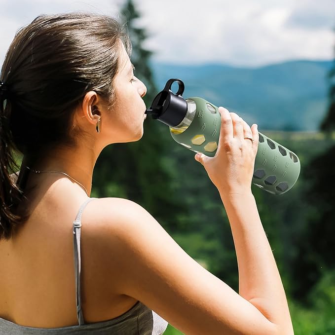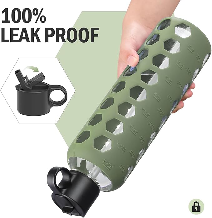 MUKOKO Glass Water Bottles, 32oz Glass Tumbler, Drinking Bottles with 2 Lids-Handle Flip Straw Lid&Bamboo Lid, Motivational Water Bottle with Time Marker and Silicone Sleeve, Leakproof-1 Pack-Olive