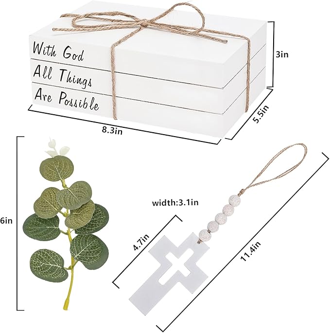 - PACKAGE: The package contains a set of wooden decorative books, wood bead garland with cross, and artificial eucalyptus leaves