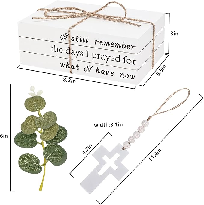 - PACKAGE: The package contains a set of wooden decorative books, wood bead garland with cross, and artificial eucalyptus leaves