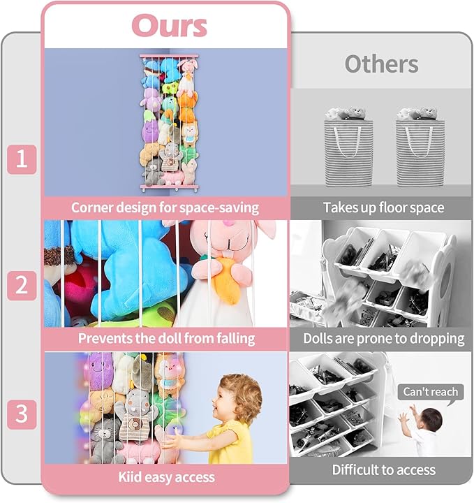 - Space Saving: Designed for use on corner wall, this stuffed animal holder will not take up extra floor space. Fan-Shaped cutting, can make full use of the corner position, which will save a lot space for you. Great hanging toy organizer for kids playroom bedroom.