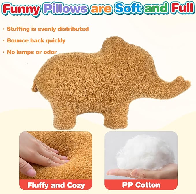 - Fun Throw Pillows Funny Decor: Dinosaur chicken nugget pillow is well made with excellent stitching. The neck, legs and pillow are full and not saggy or sparse of filling. Elephant nugget plush makes a great home decoration to thrown on the bed or couch, food stuffed animals plush novelty pillow is funny and a conversation starter. is funny and a conversation starter.