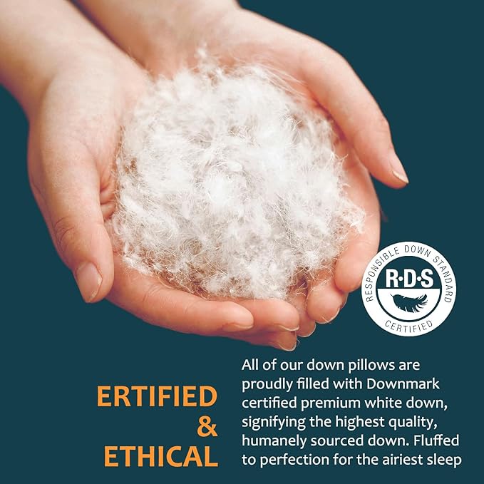 - CERTIFIED AND ETHICAL - All of our down pillows are proudly filled with Downmark certified premium white down, signifying the highest quality, humanely sourced down. Fluffed to perfection for the airiest sleep