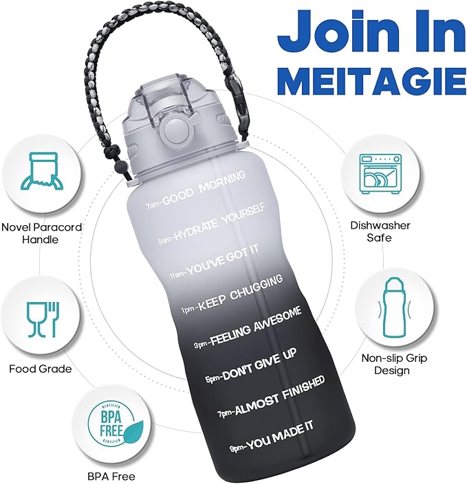 - 💎【SAFE AND NON-TOXIC MATERIAL】- Safety is our top priority. This half gallon water bottle with time maker is made of food-grade eco-friendly reusable Tritan. It is 100% BPA-free and will not release harmful chemicals even after a long time of use. It is also suitable for both warm and cold beverages. At the same time, it is dishwasher safe.