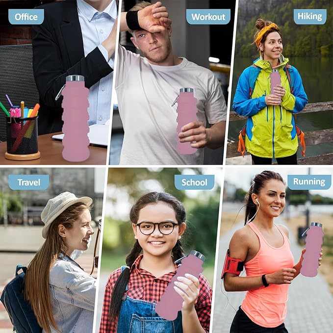 Collapsible Water Bottles 17oz, Odorless BPA-Free Silicone, Leak-Proof Foldable Reusable Bottle - Perfect for Travel Sports Gym Hiking Camping Cycling - Pink