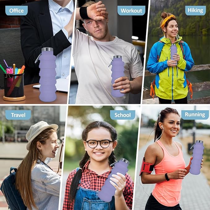 Collapsible Water Bottles 17oz, Odorless BPA-Free Silicone, Leak-Proof Foldable Reusable Bottle - Perfect for Travel Sports Gym Hiking Camping Cycling - Lavender
