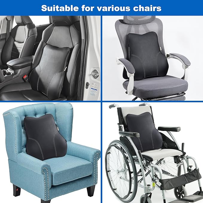 - LUMBAR CHAIR SUPPORT PROVIDES CONSISTENT COMFORT: The lumbar support pillow core is made of 100% high-quality space memory foam, which is soft and comfortable(The lumbar pillow core has an independent liner cover). the lumbar support won’t flatten, providing the same feel use after long-term use thanks to its slow rebounding, heat responsive memory foam.