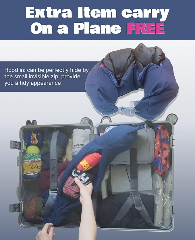 Stuffable Travel Neck Pillow, 2-Way Hoodie, Carry-on Luggage Holder, Cotton Light Blocking, for Airplane, Office, Vehicle Transportation (Navy)