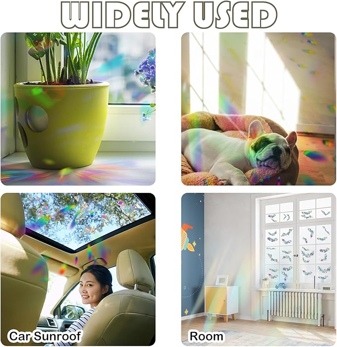 - 【Unique Design】Window decals to prevent bird strikes adopt a prism design, showing colorful colors and brightness under different light, which can please the body and mind add visual enjoyment. The design is simple and elegant, suitable for various occasions. Anti bird strike window decals are easy to disassemble and carry, making them suitable for frequent position changes.