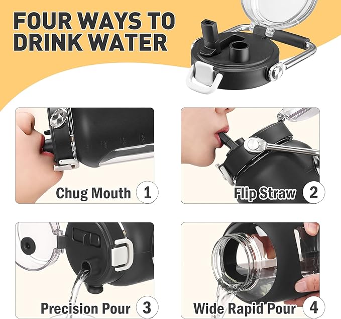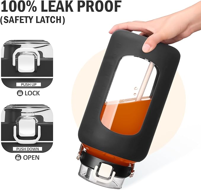 - INNOVATIVE DUAL-PURPOSE LID -The straw lid of 84oz glass water bottle offers two ways to drink. Whether you prefer sipping through a Flip Straw or chug from the Spout Mouth, the unique 2-In-1 Lid got you covered. The Leakproof lid also features a One-click Snap Lock and Dust-proof Cap for cleaner and more Hygienic drinking experience. One-handed operation-Push up to lock, Push down to unlock.