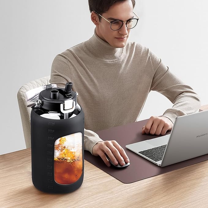 - MOTIVATIONAL VOLUME MARKER -The gallon water jug is made of thick borosilicate glass which is BPA free. Great for both cold drinks and hot drinks. Additionally, the Motivational water bottle comes with Capacity Marker in both ml and ounce measurement to help you track the water intake everyday. A must-have large hydro water bottle accurately remind you to drink the water.