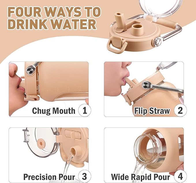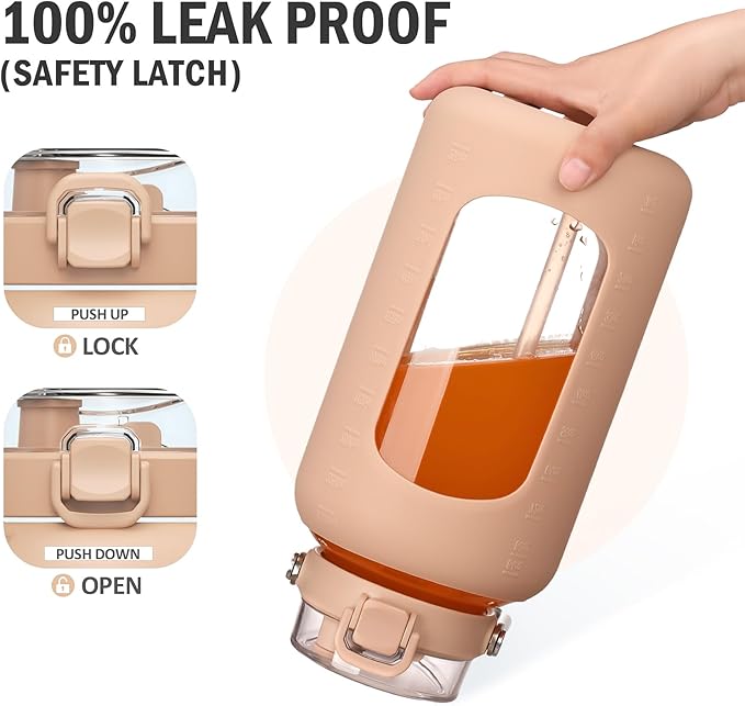 - INNOVATIVE DUAL-PURPOSE LID -The straw lid of 84oz glass water bottle offers two ways to drink. Whether you prefer sipping through a Flip Straw or chug from the Spout Mouth, the unique 2-In-1 Lid got you covered. The Leakproof lid also features a One-click Snap Lock and Dust-proof Cap for cleaner and more Hygienic drinking experience. One-handed operation-Push up to lock, Push down to unlock.
