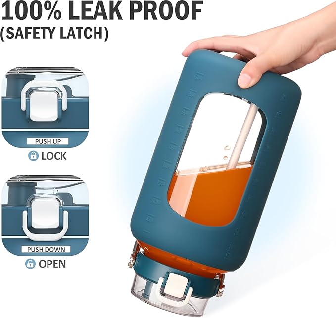 - INNOVATIVE DUAL-PURPOSE LID -The straw lid of 84oz glass water bottle offers two ways to drink. Whether you prefer sipping through a Flip Straw or chug from the Spout Mouth, the unique 2-In-1 Lid got you covered. The Leakproof lid also features a One-click Snap Lock and Dust-proof Cap for cleaner and more Hygienic drinking experience. One-handed operation-Push up to lock, Push down to unlock.
