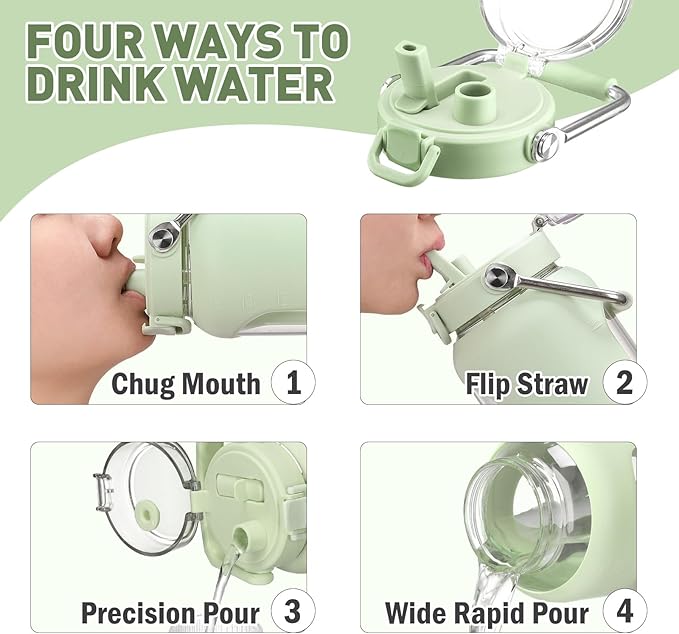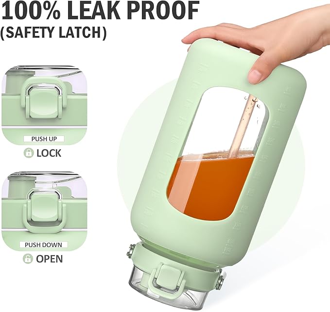 - INNOVATIVE DUAL-PURPOSE LID -The straw lid of 84oz glass water bottle offers two ways to drink. Whether you prefer sipping through a Flip Straw or chug from the Spout Mouth, the unique 2-In-1 Lid got you covered. The Leakproof lid also features a One-click Snap Lock and Dust-proof Cap for cleaner and more Hygienic drinking experience. One-handed operation-Push up to lock, Push down to unlock.