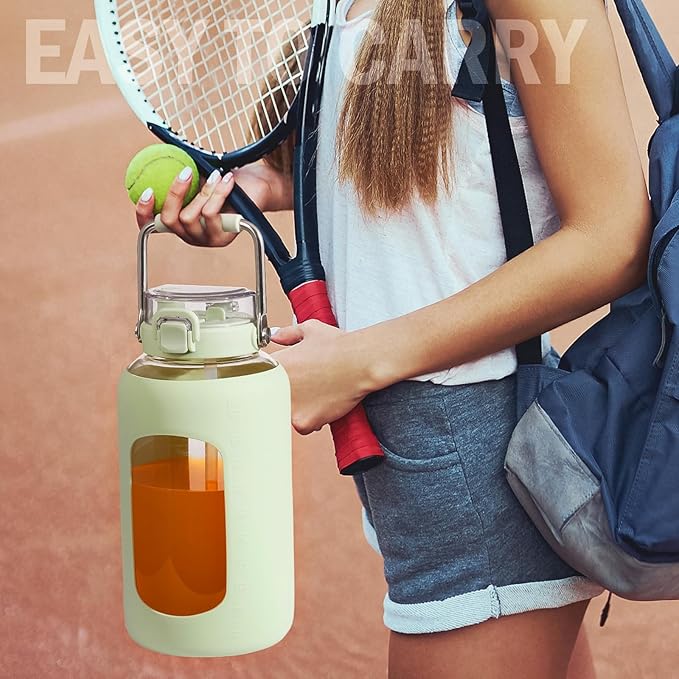 84oz Glass Water Bottle with Stainless Steel Handle,2.5L Gallon Water Bottle With 2-IN-1 Straw Lid, Silicone Sleeve and Motivational Capacity Marker, Wide Mouth Water Jug For Gym, Workout, Green