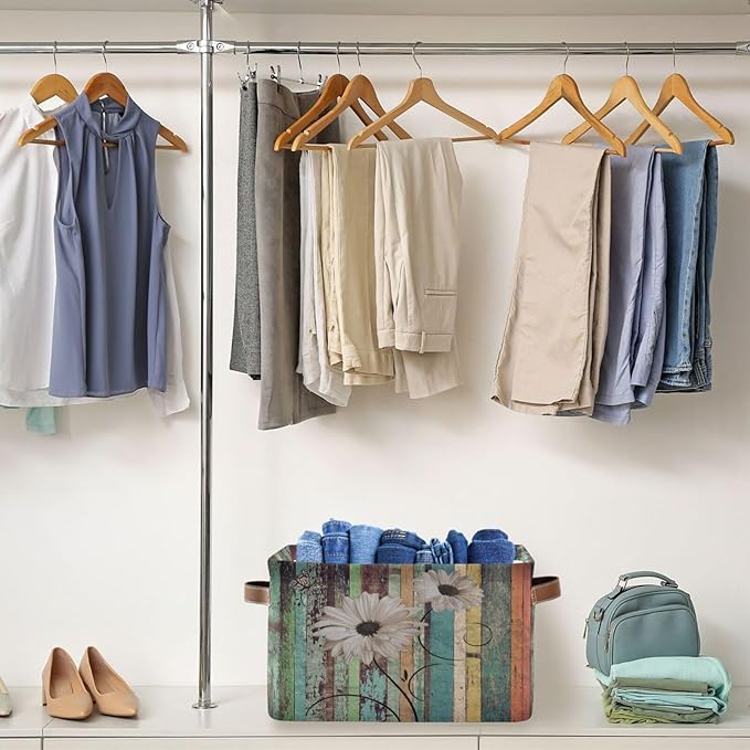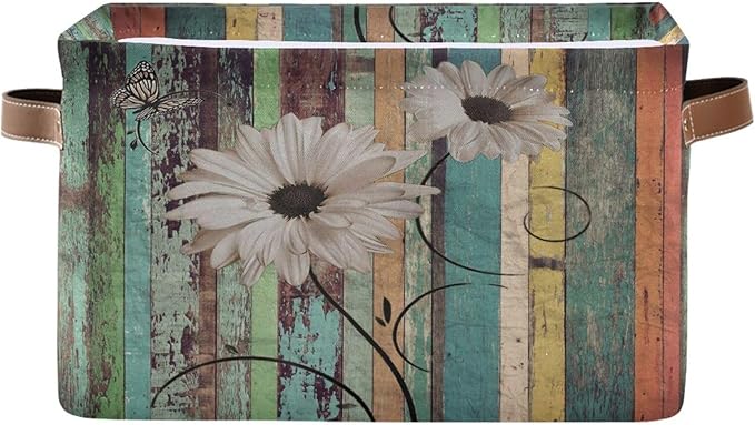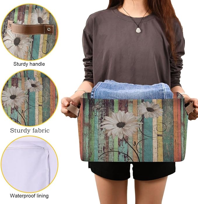 Vintage Daisy Board Storage Basket Bin for Shelves Closet Floral Wooden Foldable Fabric Storage Box Cube with Handles Kids Gifts Toys Cloth Shelf Basket Organizer for Bedroom Nursery Home Decor