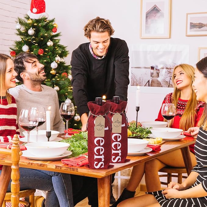 - DESIGN: Burlap wine bag with a built-in drawstring design and "cheers" printed on the bottle,making it easy to open and close. Convenient for storing wine bottles or wrapping/packing similar shaped gifts.