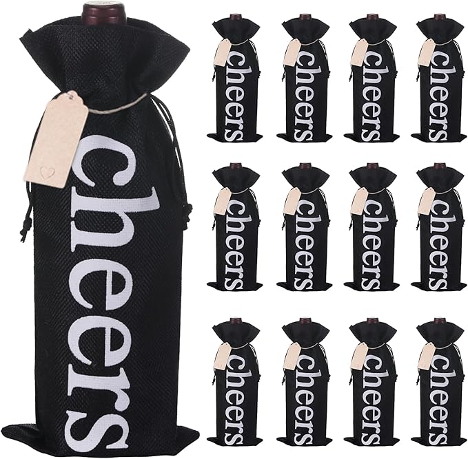 - DESIGN: Burlap wine bag with a built-in drawstring design and "cheers" printed on the bottle,making it easy to open and close. Convenient for storing wine bottles or wrapping/packing similar shaped gifts.