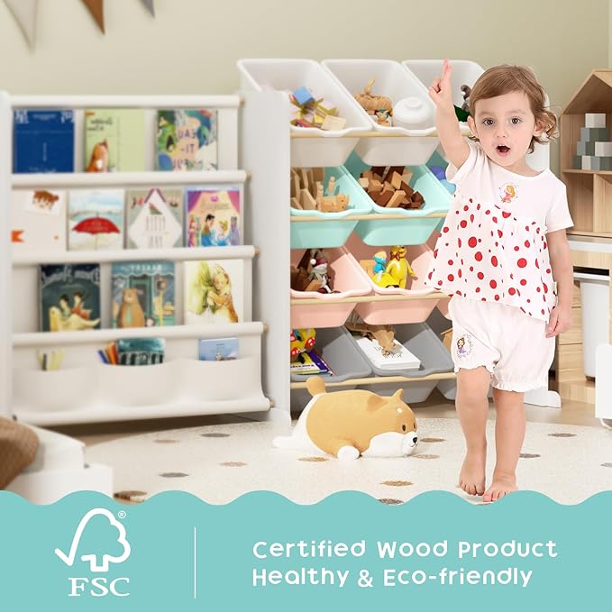 - Large Storage Space: The 12 toy bins and 4 shelves of this toy storage with kids bookshelf provide a large capacity storage area , which eliminates the need for children to rummage through boxes in order to locate their toys. This toy organizer is an ideal solution for storing books and toys for play room, nursery, or kids room.