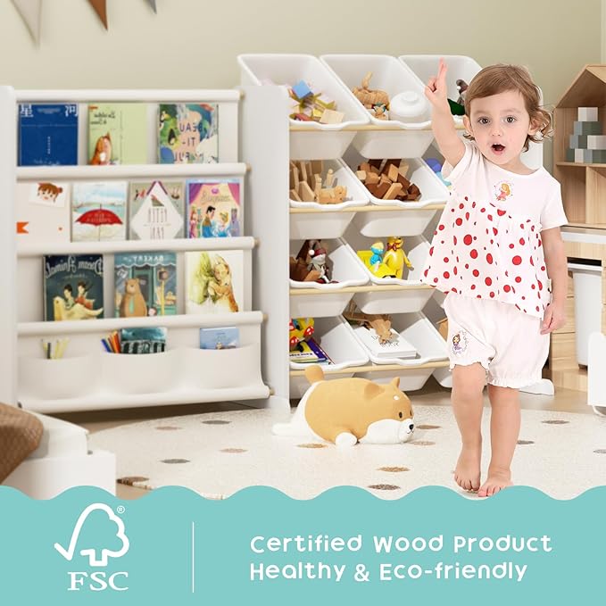 - Large Storage Space: The 12 toy bins and 4 shelves of this toy storage with kids bookshelf provide a large capacity storage area , which eliminates the need for children to rummage through boxes in order to locate their toys. This toy organizer is an ideal solution for storing books and toys for play room, nursery, or kids room.